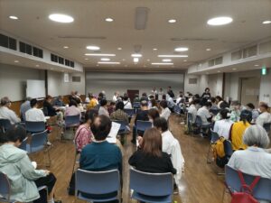 今回の研修では、大津市危機防災対策課から3名の職員の方に来ていただき、「防災」に関するさまざまな観点からのお話をしていただきました。特に、もし大津市で地震が起こった際に、想定される被害や、とるべき行動についてのお話は、みなさんとても熱心に耳を傾けておられました。講演後のグループに分かれての意見交換会では、日頃からの備えや、正確な情報収集の方法などについて、積極的な意見がかわされました。また段ボールベッドや組み立て式トイレのほか、さまざまな防災関連グッズの展示品に実際に触れてみて、会員さんたちの防災に関する意識が、いっそう高まったのではないかと思われました。